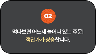 매장 홀뿐만 아니라 배달과 포장까지 아우르며 다각도의 매출 구조를 제공합니다. 유행과 계절에 흔들리지 않고 언제 어디서나 안정적인 수익을 낼 수 있는 시스템, 그것이 김앤초밥의 힘입니다.